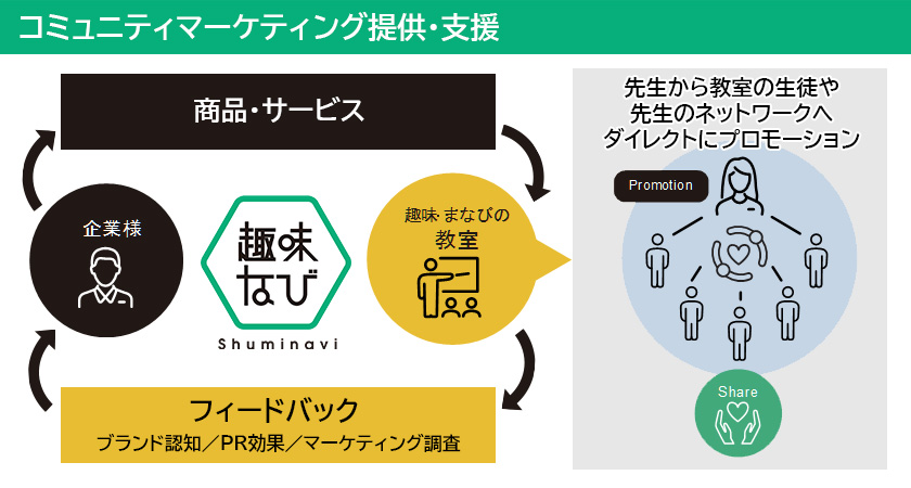 今注目の“習い事コミュニティ”を活用し、企業向けマーケティング支援サービスを行う「趣味なび」。全国21,000以上の趣味・まなびの教室で、オンライン、オフライン問わず商品のプロモーションをすることが可能です。アットホームな趣味のコミュニティで、貴社商品・サービスのファン創出を支援します。
