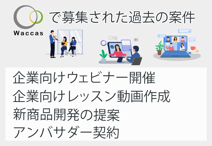 Waccasは講師としての経験やスキルを活かして民間企業や学校、行政団体などから様々なお仕事を受け、報酬を得られるサービスです。講師としての経歴に書くことができれば、教室運営や自分のプロモーションのプラスにもなります。もちろん、利用料は一切かかりません。