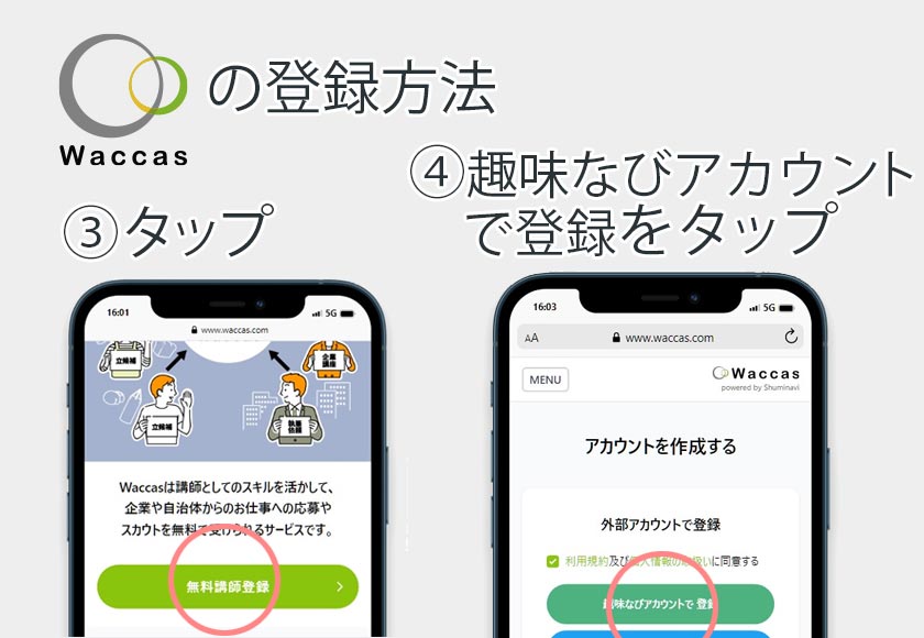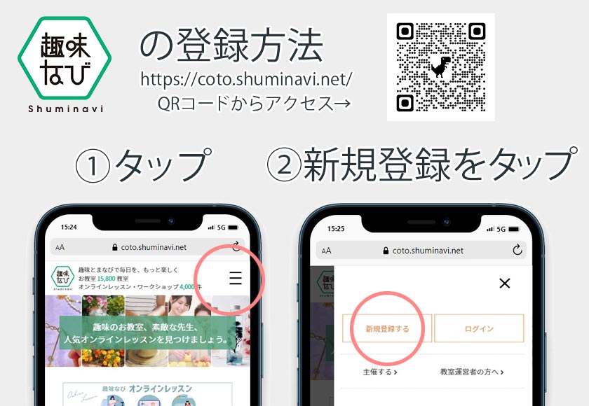 3)無料講師登録をタップ4)趣味なびアカウントで登録をタップ