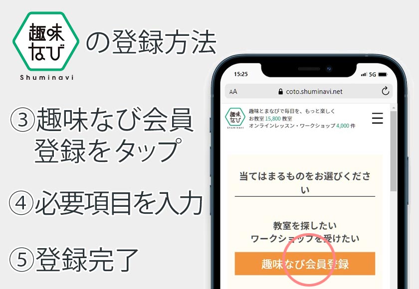3)『趣味なび会員登録』をタップ4)必要事項を入力5)登録完了