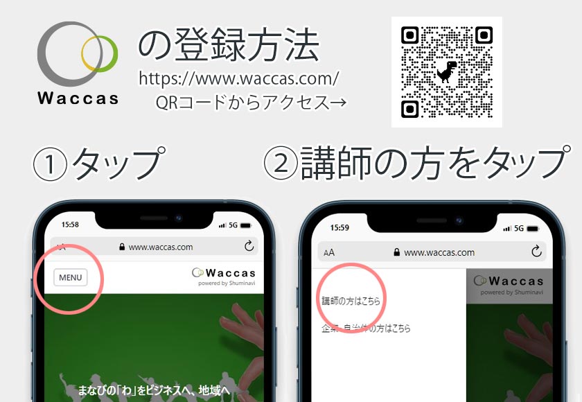 WaccasのHP にアクセス1)MENUをタップ2)講師の方はこちらをタップ
